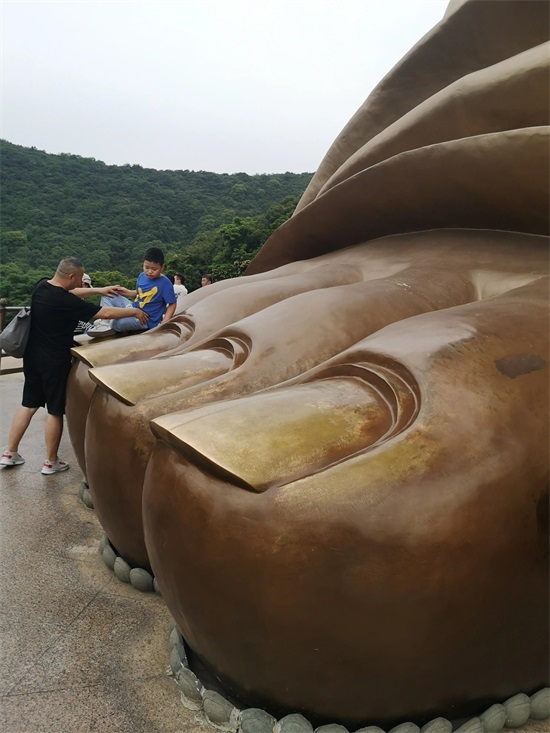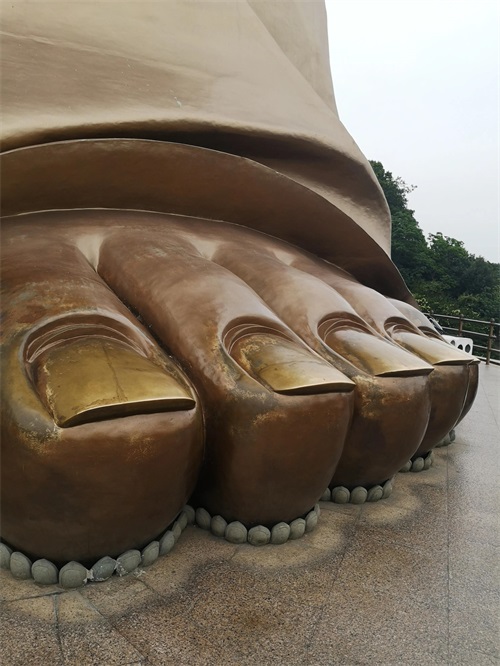 登电梯到大佛面前,抱抱佛脚祷告,摸摸指甲求福,心中默念:“抱佛脚,喜庆到;摸摸指甲,金钱到家”。