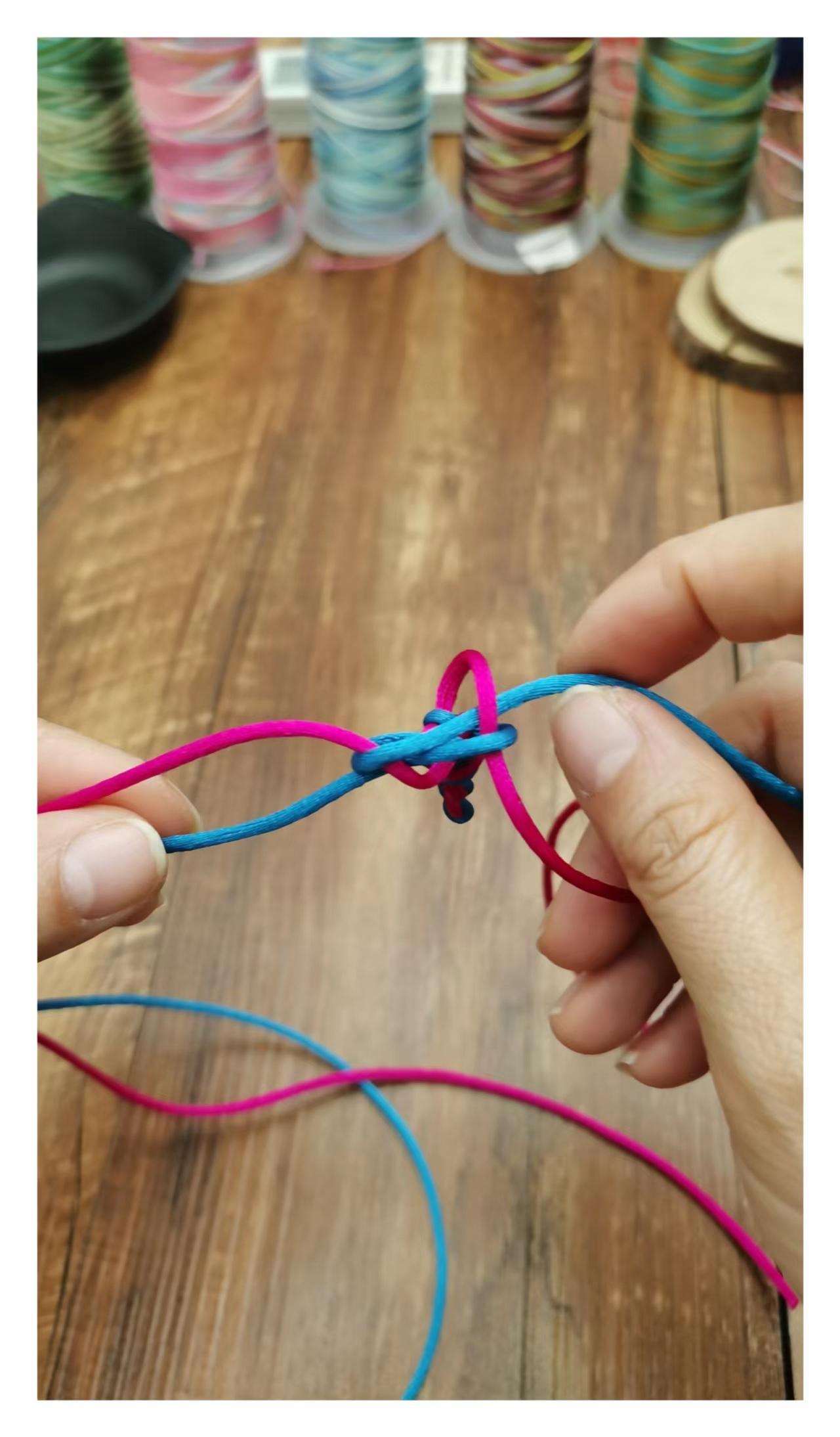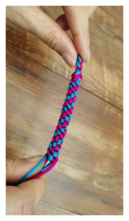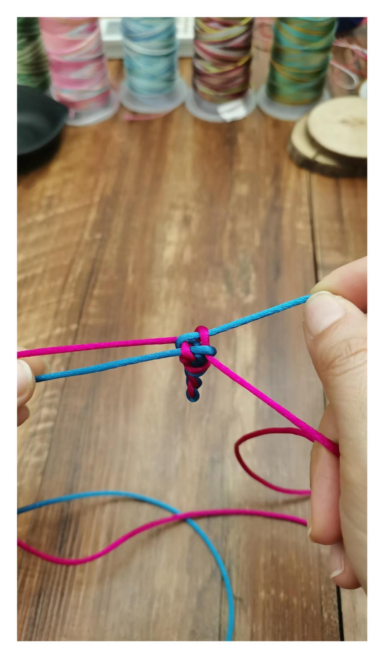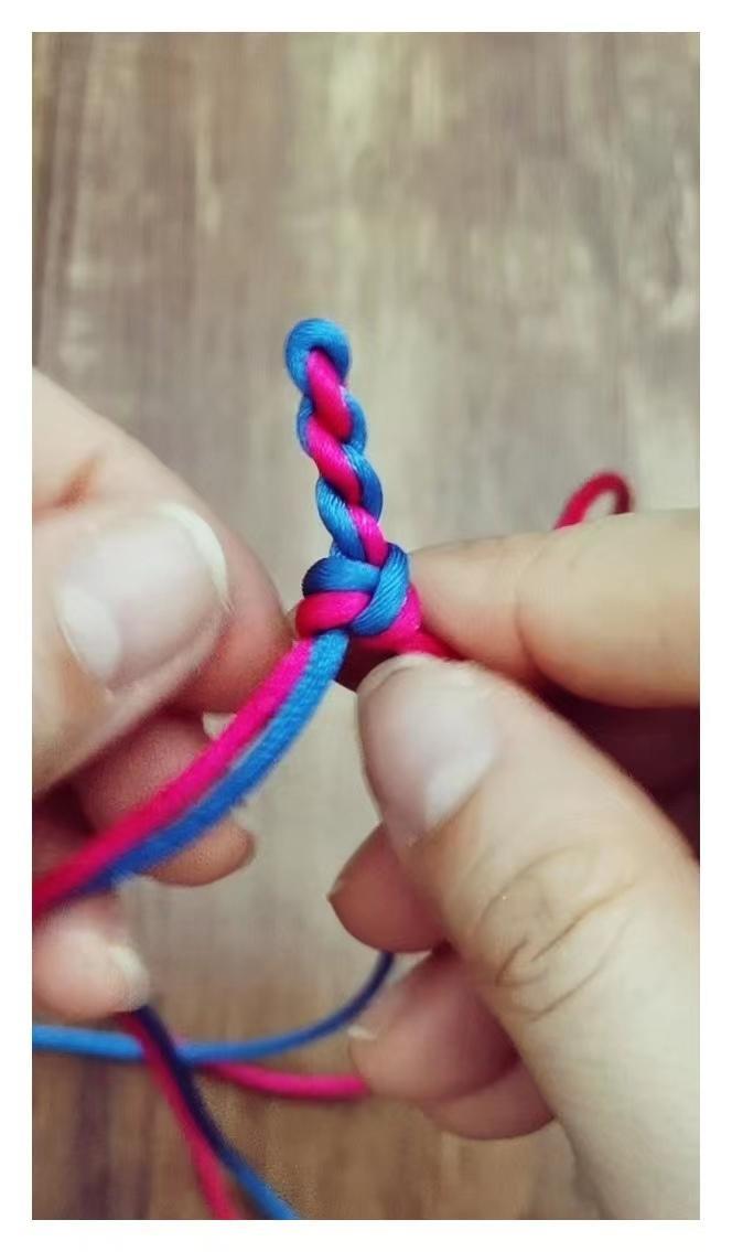 然后力道均匀的把四根线拉紧,就打好了一个玉米结,按照以上步骤重复编织到需要的长度就好。
