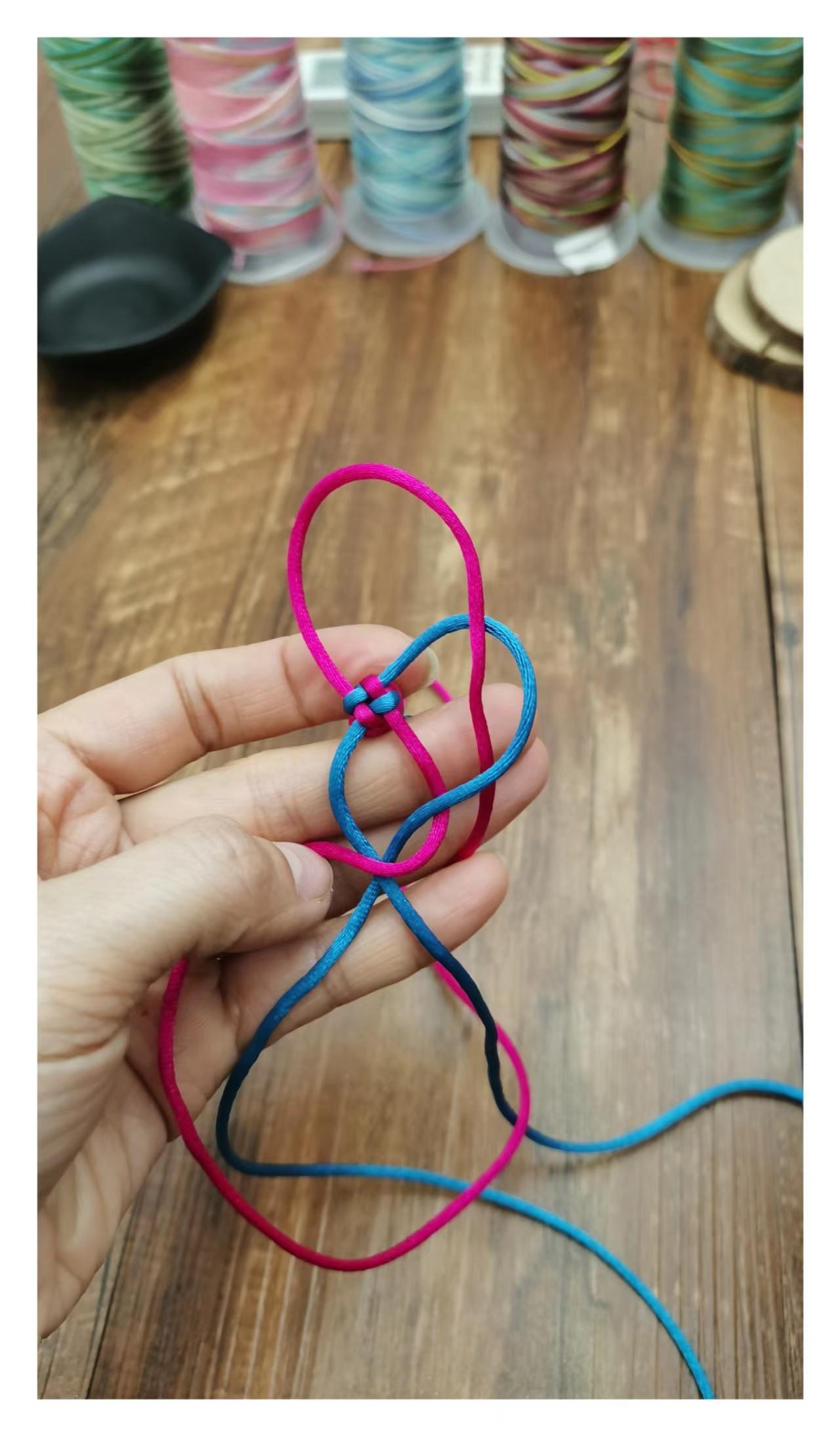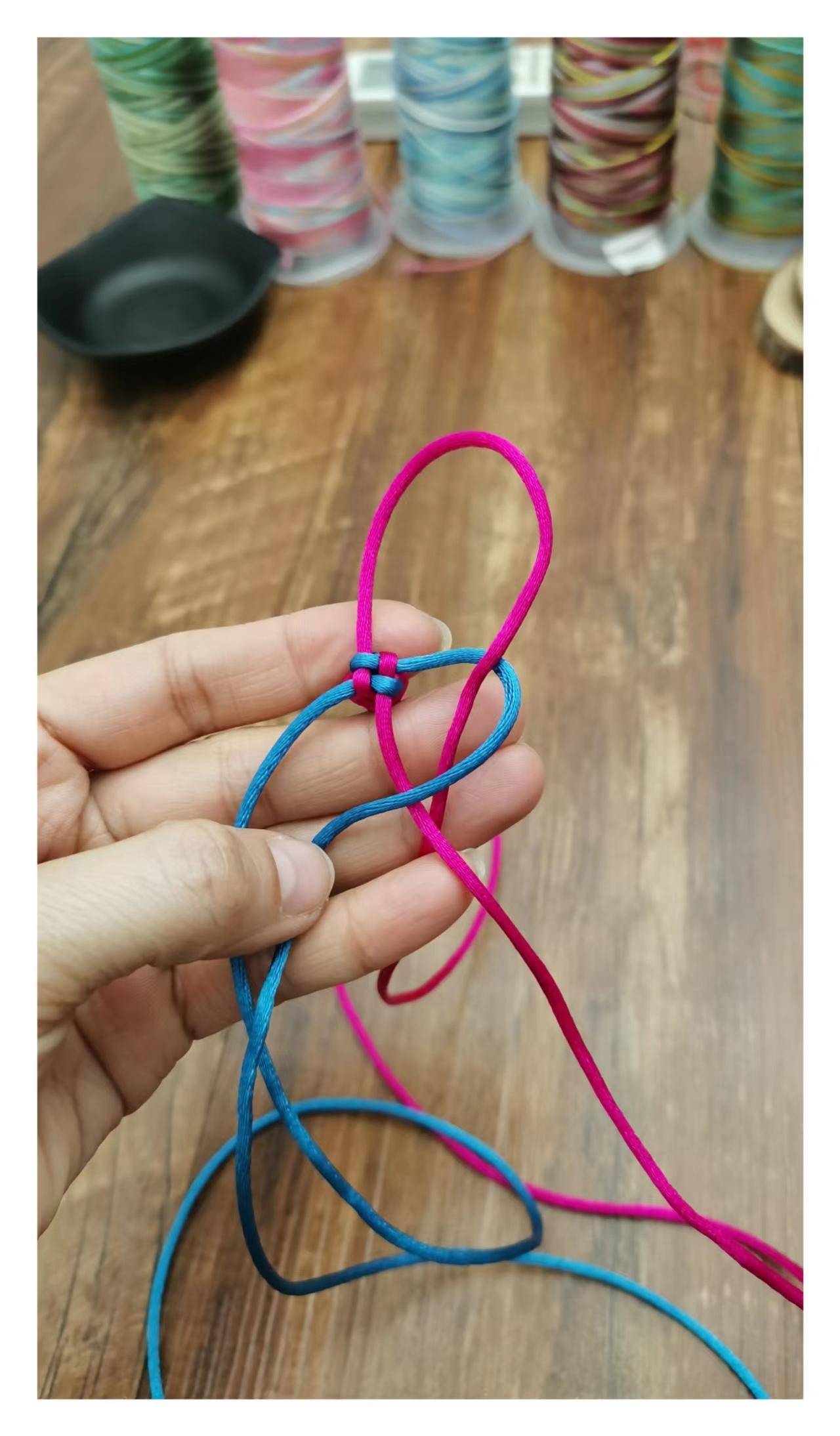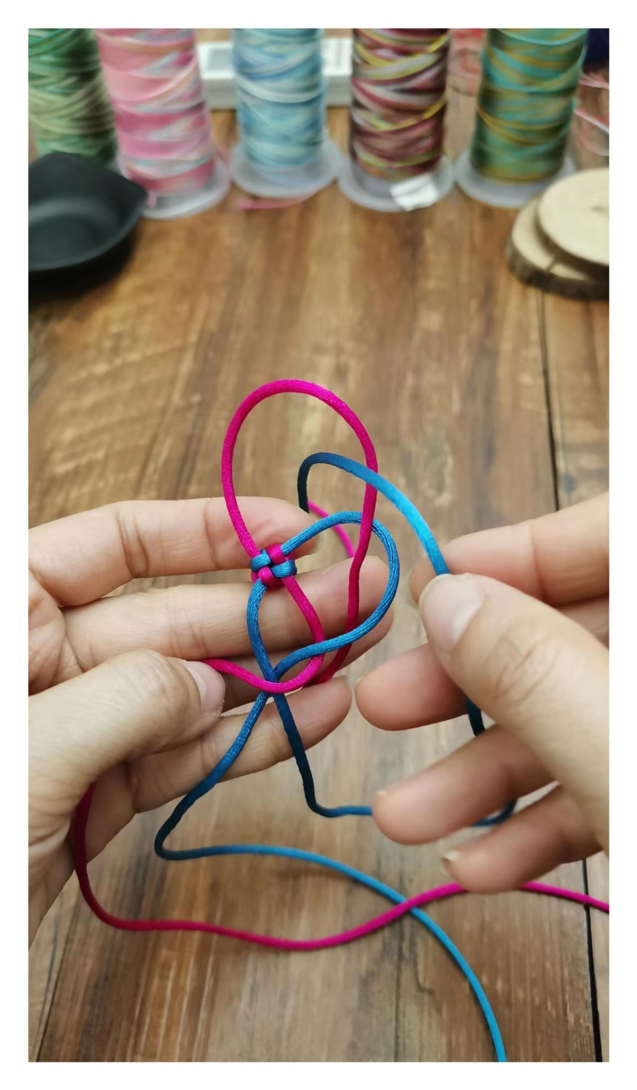 然后力道均匀的把四根线拉紧,就打好了一个玉米结,按照以上步骤重复编织到需要的长度就好。
