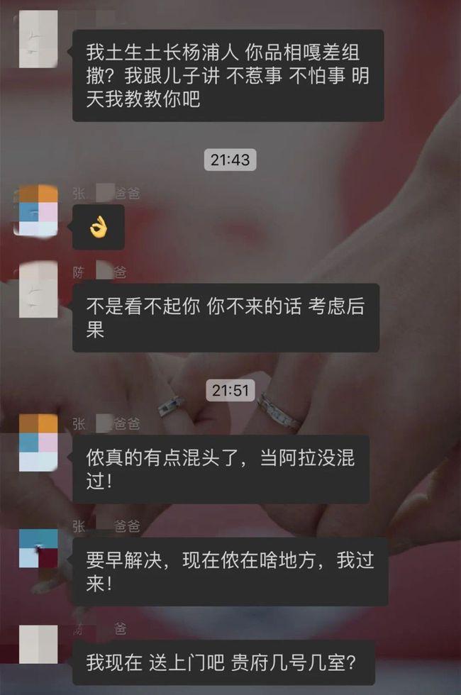 看到聊天记录,小编也真的是笑了,这感觉就像两个青春期的孩子在互相放狠话斗殴,但是这两位家长可不是闹着玩的,说打还真的打!9月30日早上八点多,陈同学的爸爸就带着U型锁直接敲伤张姓学生爸爸的头部,老师立刻拨打了120和110,校方也已经向上级主管部门进行了上报。