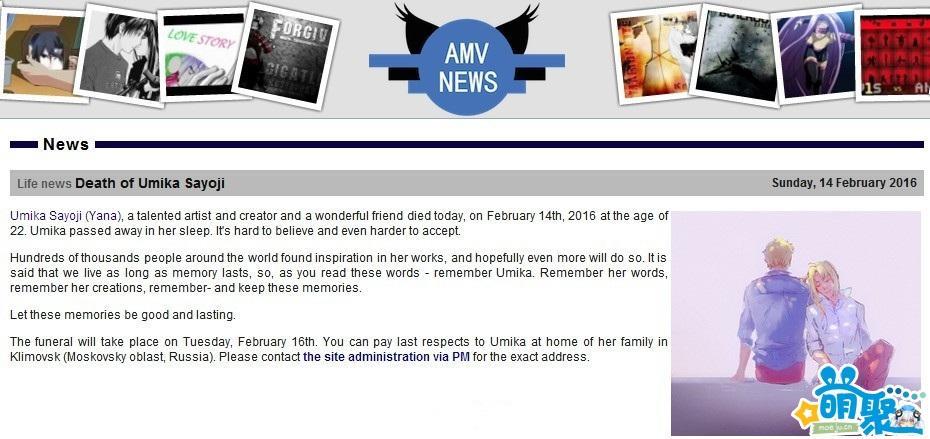 俄罗斯著名AMV作者UMIKA去世 曾创《秋山澪与折木奉太郎的爱情故事》