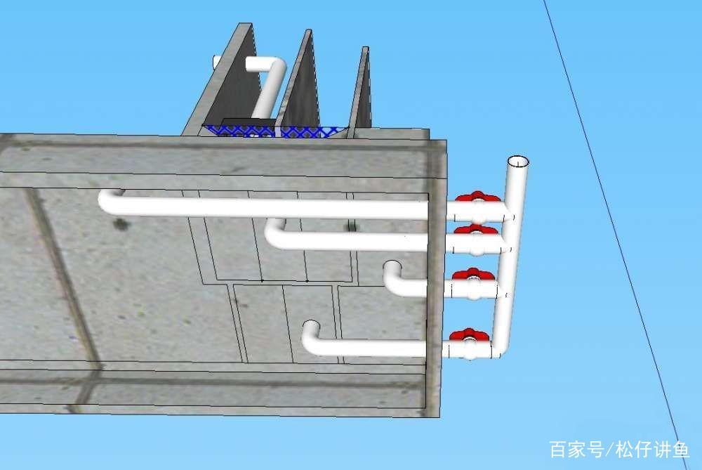 主池排污设计在了出水口下方,因为这个位置是理论死角,可定期排掉吸不走的鱼便。另外池内的白管是面吸(除油膜功能),眼部高度没限制,弯头不要粘死,这样面吸口可以根据水面高度来调整