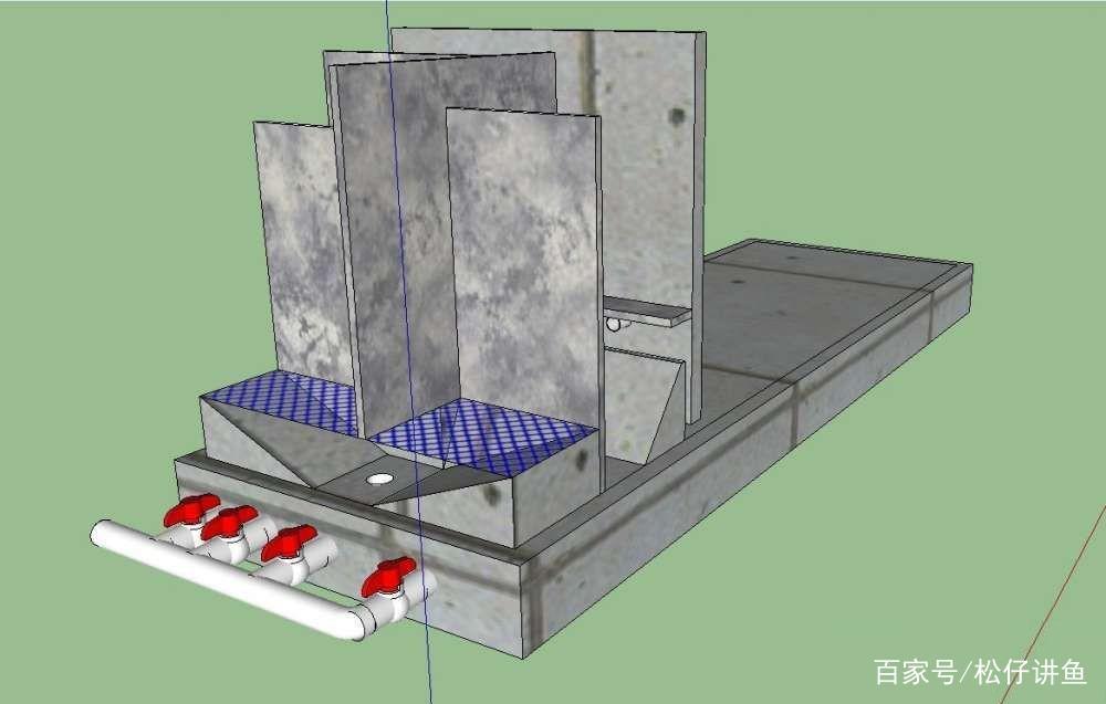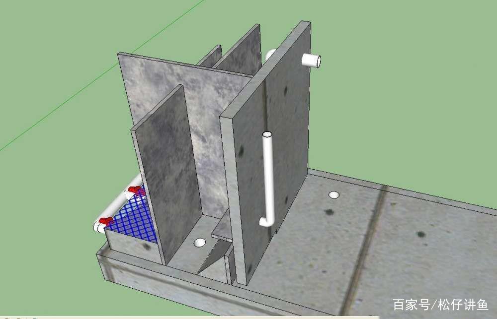 过滤第一格是沉淀仓,横着的挡板为了缓流,斜坡设计是为了更方便的收集鱼便。