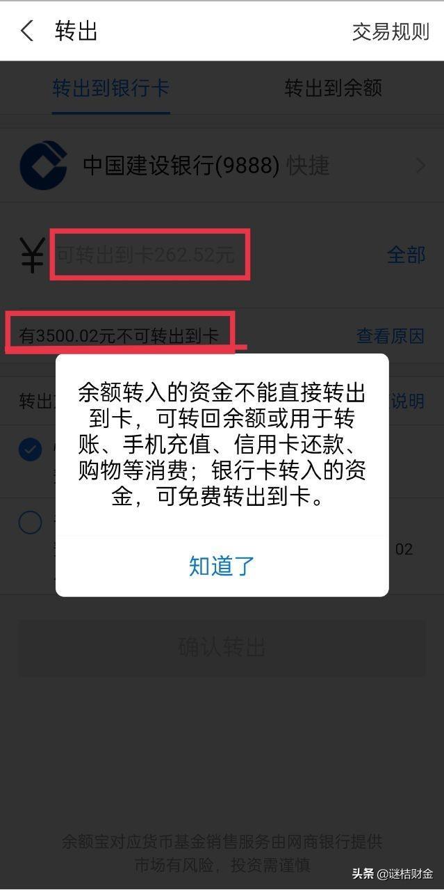 不过~如果余额宝中的资金是通过余额转入的话,那么这部分资金不可直接转出到银行卡。以谜桔下面这张截图为例,谜桔余额宝目前可用(冻结金额不包含在内)的金额为3762.54元,可转出到银行卡的金额是262.52元,其中有3500.02元不可转出到银行卡,这部分不可直接从余额宝转出至银行卡的钱是通过余额转入的。根据【查看原因】页面的信息提示~从余额转入至余额宝中的钱可转回余额,或用于线上购物、线下消费支付、生活缴费、信用卡还款等~