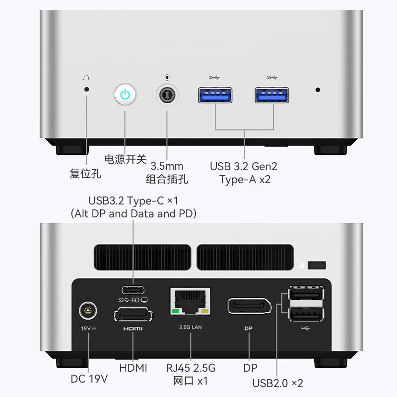 此外,该设备配有一个USB 3.2 Gen2 Type-C接口(支持Alt DP模式和PD充电)、两个USB 3.2 Type-A接口、两个USB 2.0接口、一个2.5 Gbps网口、一个HDMI接口、一个DP接口、以及一个3.5mm音频插孔等。