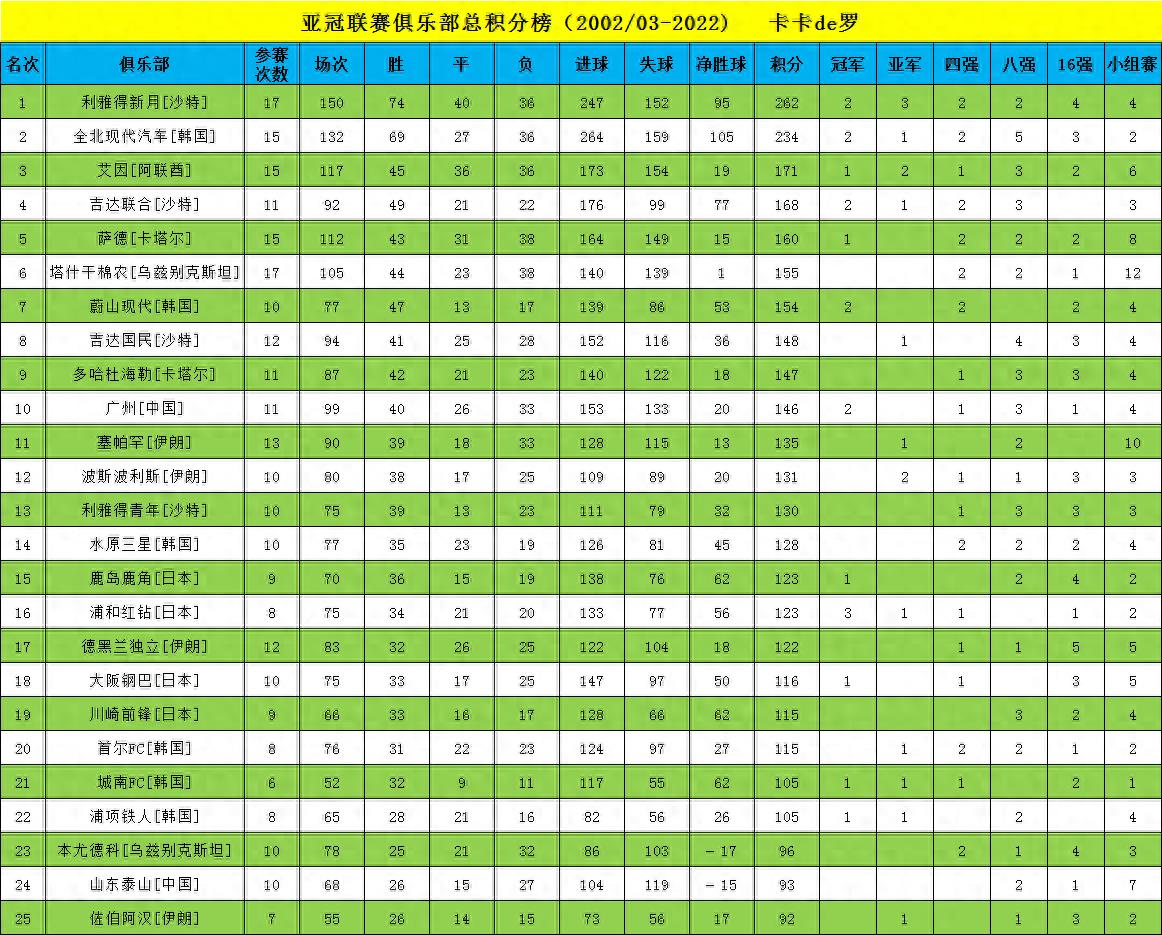 数据对排名前25位的俱乐部按积分高低进行排名。包含了亚冠联赛自2002/03赛季以来小组赛及之后淘汰赛的数据,不包含资格赛数据。统计日期截止到2023年5月7日(2022赛季决赛后),不含2023/24赛季数据。