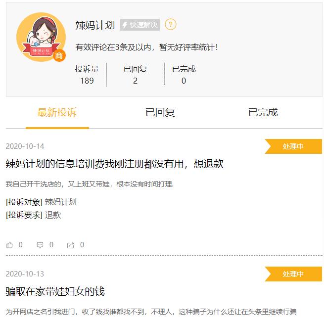 赵女士的情形并非个例,记者发现,从2020年5月,陆续有用户在黑猫投诉平台投诉“辣妈计划”。“辣妈计划”多次占据黑猫投诉教育培训黑榜榜首,截至10月14日,投诉量达203条,回复两条,没有一条投诉被解决,“骗人”、“退费”是关键字眼。
