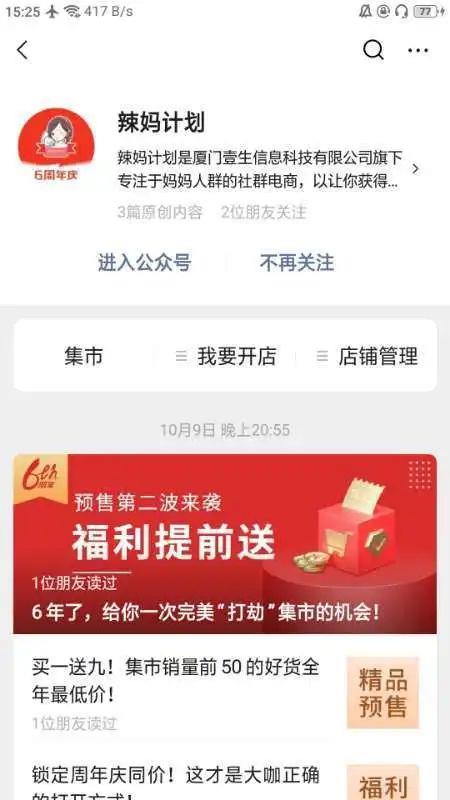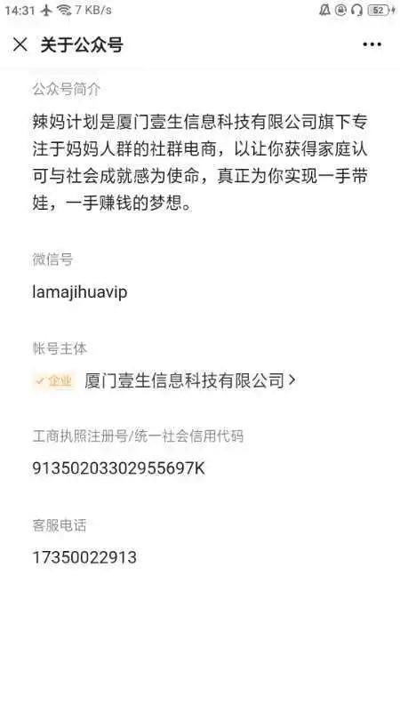 微信公众号显示,“辣妈计划”账号仍正常更新,近期正发布周年庆活动,账号主体为厦门壹生信息科技有限公司。