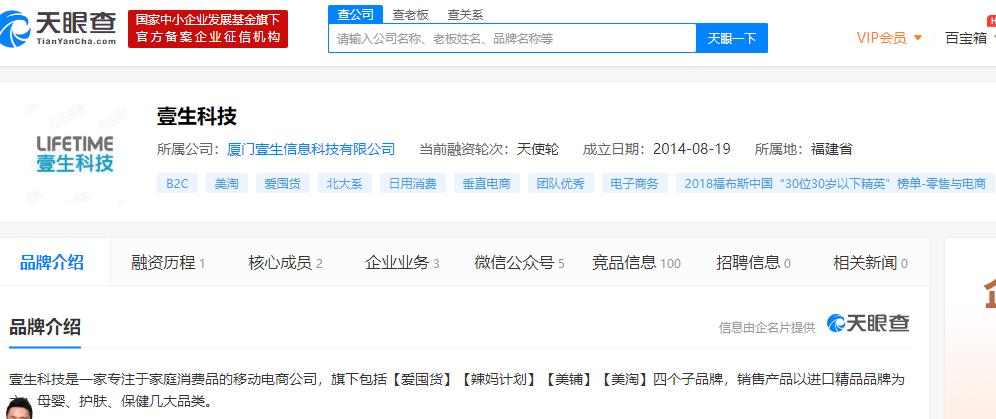 天眼查显示,壹生科技品牌属于厦门壹生信息科技有限公司,成立于2014年,从事科技推广和应用服务业,专注于家庭消费品移动电商,旗下有“爱囤货”、“辣妈计划”、“美铺”和“美淘”四个子品牌,以销售进口产品为主。