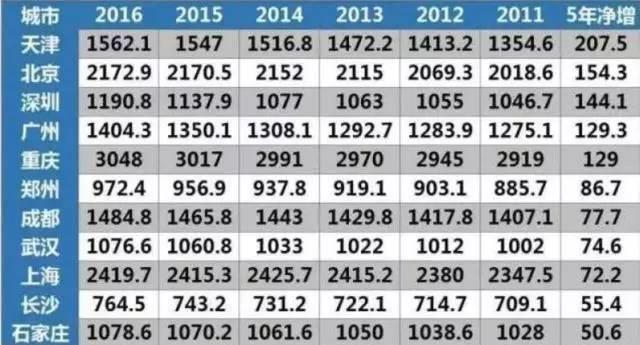 这张图表示的是从2011到2016年这五年间,全国重点城市人口净流入排行榜,天津以5年净增207.5万居榜首,郑州以净增86.7万排第六。由此可见郑州对流动人口的吸引力还是很强的。一般情况,一直保持大幅度人口净流入的城市,房价是很难下跌的。
