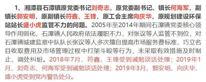 2、湘潭县发展和改革局副局长卢旺、价格检查所所长胡栋,石潭派出所教导员王斌(主持石潭派出所工作),副所长阳京峰,原所长易义超,原副所长洪晓山、刘志勇,民警周文祥、陈日、田新履责不力的问题。湘潭县发展和改革局价格检查所对张议等人收费项目没有监督检审,对其乱收费行为监管不力。石潭派出所有关人员对张议“涉恶”团伙长期以来违法犯罪活动,未履行法定职责积极调查取证,未严格依法审核把关作出处理,对张议等人违法犯罪行为定性不准、有案不立,未进行有效打击,客观上纵容了张议“涉恶”团伙滋生壮大。2018年7月,卢旺、胡栋受到诫勉谈话处理;2019年1月,王斌、阳京峰、周文祥受到政务警告处分;2019年3月,易义超、陈日分别受到党内严重警告、政务记大过处分;洪晓山、刘志勇受到诫勉谈话处理;田新受到提醒谈话处理。