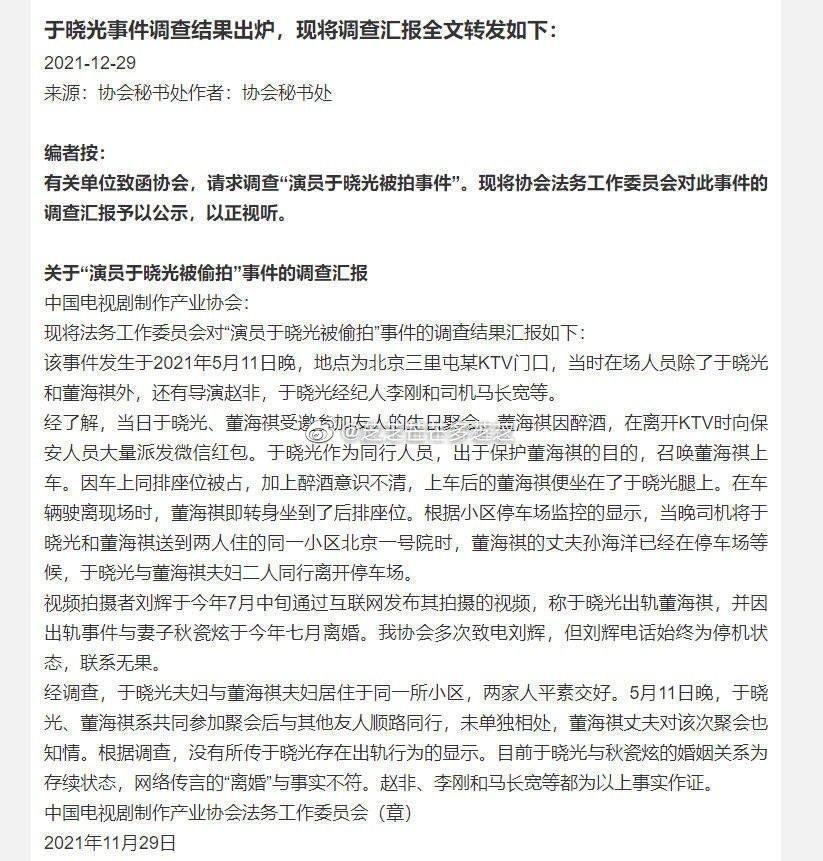 不过,于晓光这样的举动,却引来一些嘲讽的声音,因为很多不明真相的网友认为于晓光当初都出轨了,如今是为了蹭老婆的热度露脸。也正是因此,网络上一则2021年底,中国电视剧制作产业协会公开宣布的“演员于晓光被偷拍”事件的调查汇报再度登上热搜。通过官方调查显示,于晓光和坐在其大腿上的女子董海祺,并无出轨行为。董海祺夫妇和于晓光夫妇住在同一小区,两家人平素交好。当天董海祺是因为醉酒,上车后前排座位已经被坐,她才做出了一个意外的偶然举动,车开之后,董海祺又坐到了后排。通过监控显示,回到小区之后,董海祺的丈夫已经提前在停车场等候,随后接走了董海祺。而当时的爆料人,在官方调查过程中,一直躲着不敢接电话,足见这位爆料人确实是有些心虚啊。