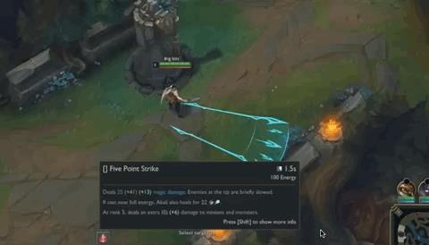 这是一个范围AOE技能,阿卡丽在释放技能后会对前方一片区域放出五把苦无剑,造成伤害的同时并减速末端的目标,若阿卡丽在释放Q技能时能量是满格,那么就会让阿卡丽恢复生命值,如果Q技能点到满级,则会对小兵以及野怪造成额外伤害!