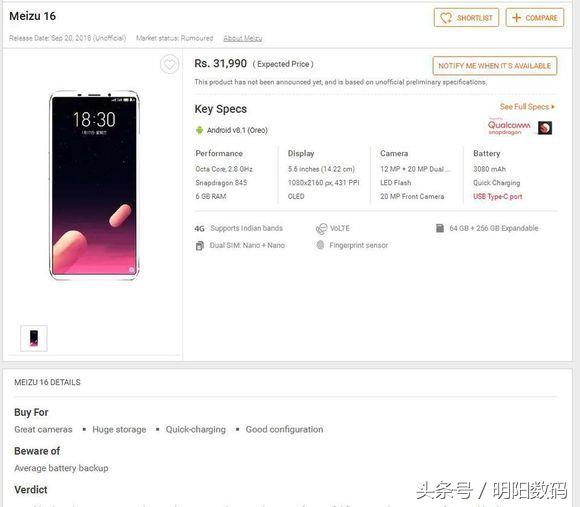 魅族16详细参数表,正面板类似魅蓝E3,5.6英寸小巧机身