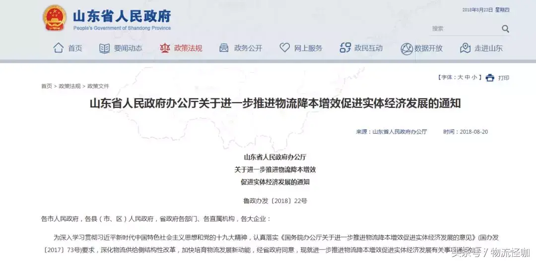 8月20日,山东省人民政府办公厅发布了《山东省人民政府办公厅关于进一步推进物流降本增效促进实体经济发展的通知》。