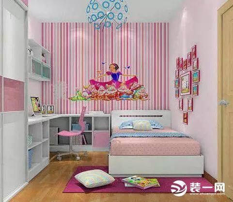 这款卧室的设计在颜色上以浅色为主,可是满满的背景墙设计让整个卧室就显得非常的具有视觉上的冲击力了,满满的卡通图案,床上很多的卡通人物玩偶,让整个卧室呈现出不一样的可爱感。