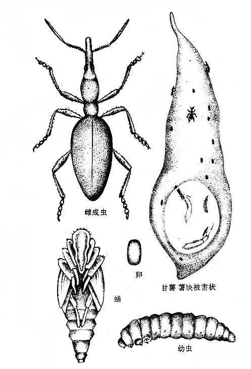 卵喜产在露出土面的薯块上,先把薯块咬一小孔,把卵产在孔中,一孔一粒,每雌产卵80一253粒。