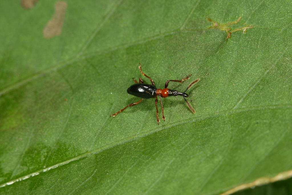 成虫体长5—7.9mm,狭长似蚊,触角末节、前胸、足为红褐色至桔红色,余蓝黑色,具金属光泽,头前伸似象的鼻子,复眼半球形略突,黑色;