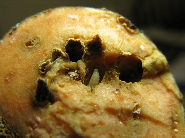 末龄幼虫体长5—8.5mm,头部浅褐色,近长筒状,两端略小,略弯向腹侧,胸部、腹部乳白色有稀疏白细毛,胸足退化,幼虫共5龄;