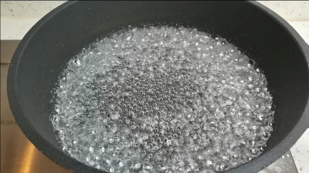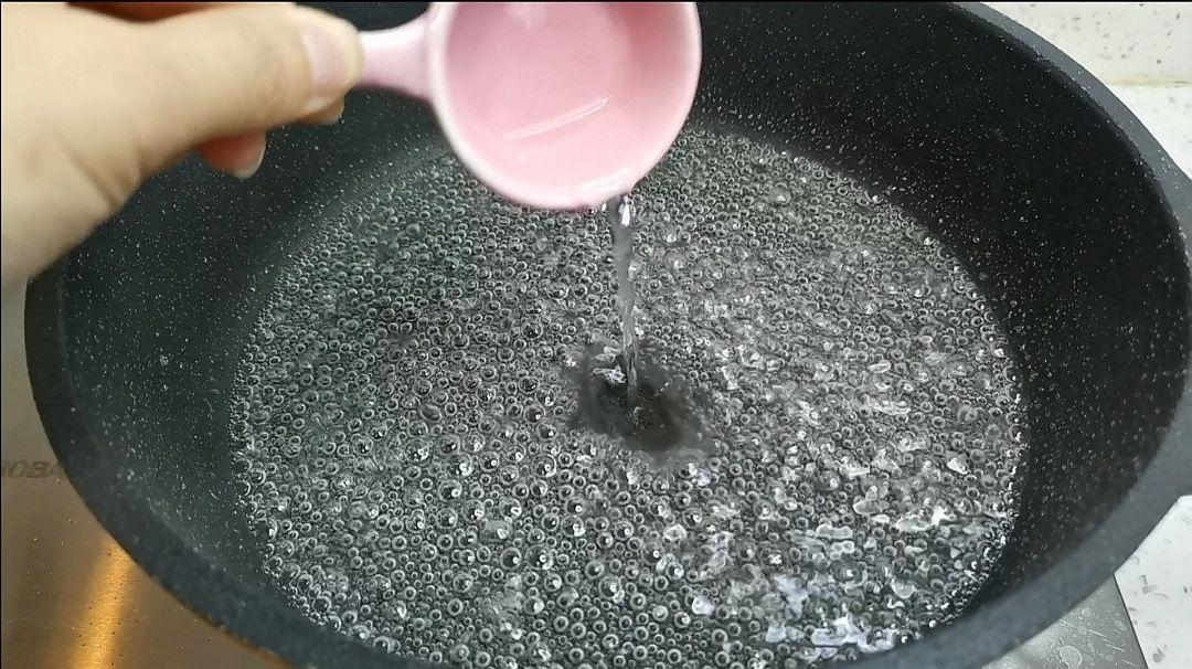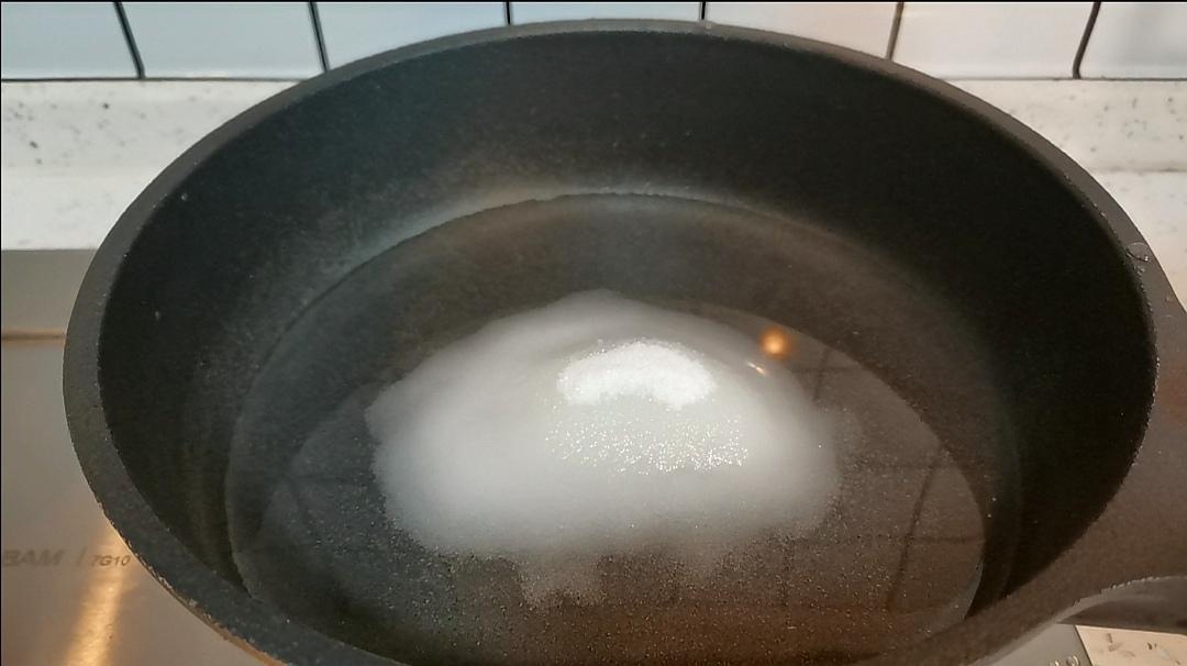 第三步:开始炒糖,用冰糖或者白糖都可以,糖和水的比例是1:1,先开大火把糖熬化,再开小火慢慢熬,刚开始你会发现糖水起透明的大泡泡,继续熬,把水份熬干。直到出面密集的小泡泡并且糖水有些发白,迅速倒入5克白醋,搅匀关火。让糖水稍微冷却20秒。直接放山楂容易烫破山楂皮。