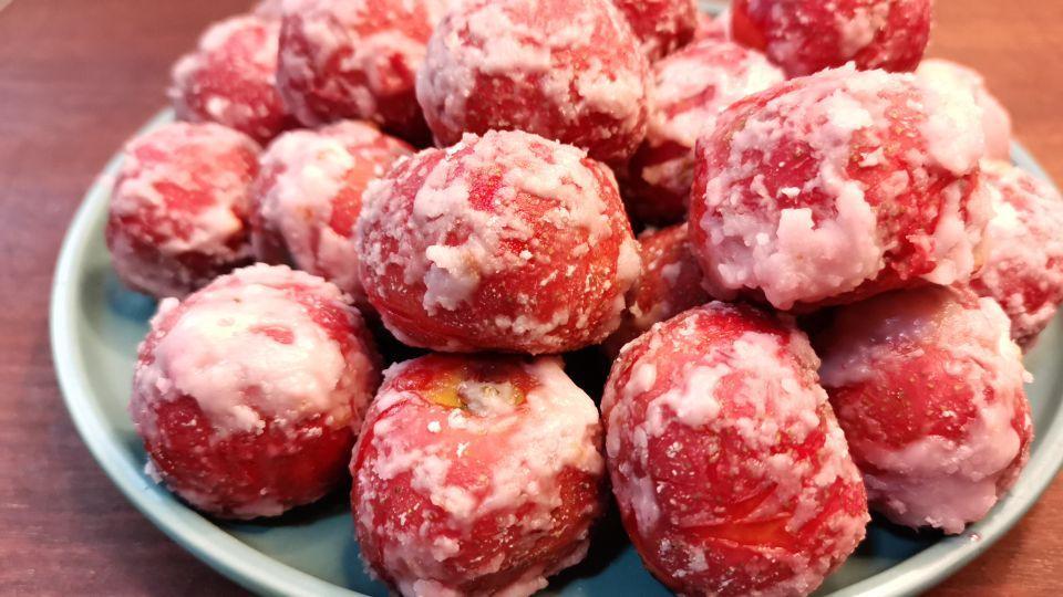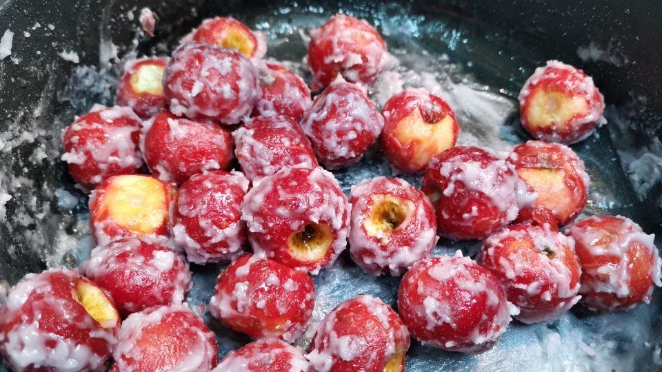 第四步:冷却20秒以后,迅速倒入山楂,快速翻动,动作要快,但是不能太猛,不然山楂容易戳破。刚开始会是黏黏的状态,继续翻拌,很快表面的糖开始发白发硬凝固成白色。彻底放凉,我们的山楂糖雪球就做好啦!