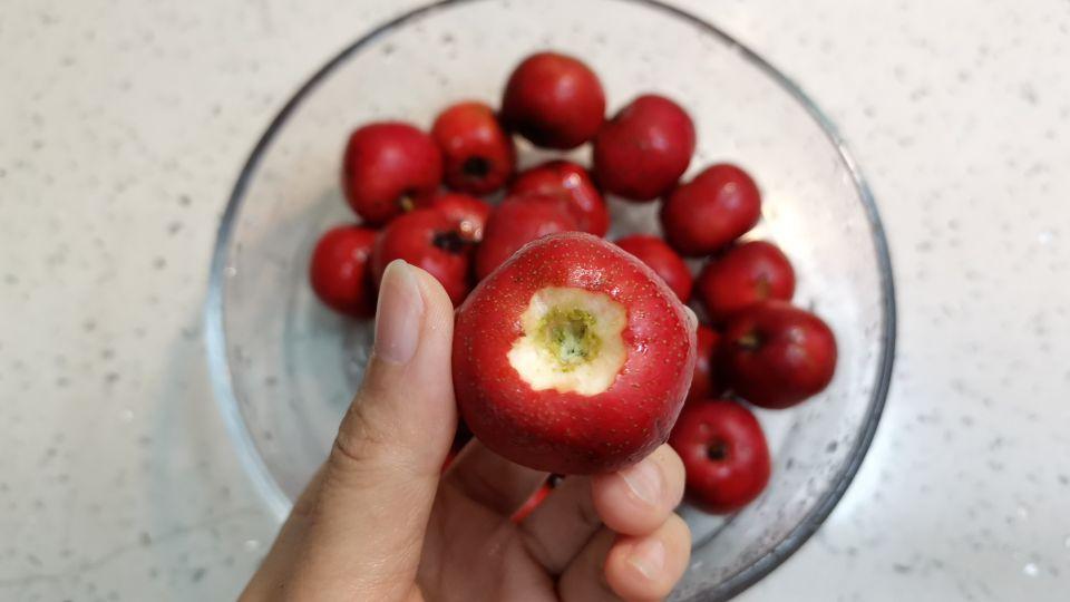 第二步:用刀挖去山楂的果蒂。山楂的果蒂里残留了非常多的杂质我们自己在家做最好还是挖出来。处理好的山楂一定要晾干水分,这也是山楂挂糖不容易脱落的关键。