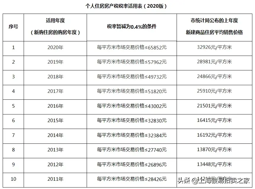 适用税率暂定为0.6%。应税住房每平方米市场交易价格低于本市上年度新建商品住房平均销售价格2倍(含2倍)的,税率暂减为0.4%。上述本市上年度新建商品住房平均销售价格,由市统计局每年公布。