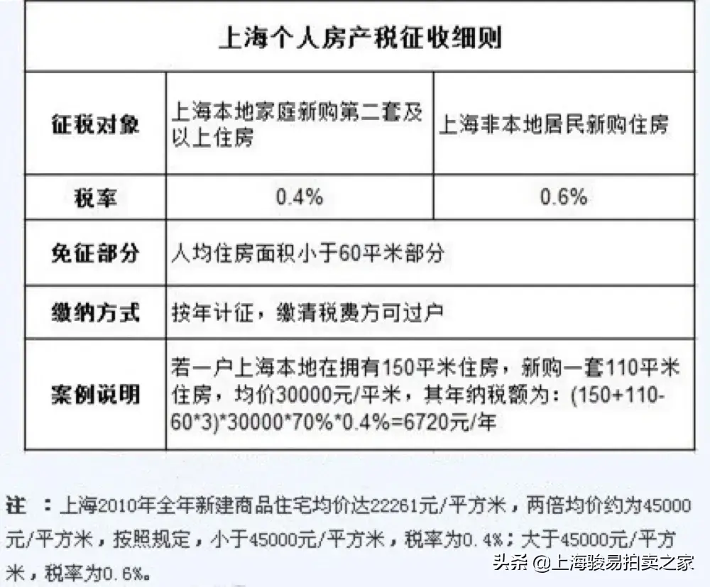 3. 房产税征收标准计算公式:上海应税住房年应纳房产税税额(元)=新购住房应征税的面积(建筑面积)×新购住房单价(或核定的计税价格)×70%×税率。