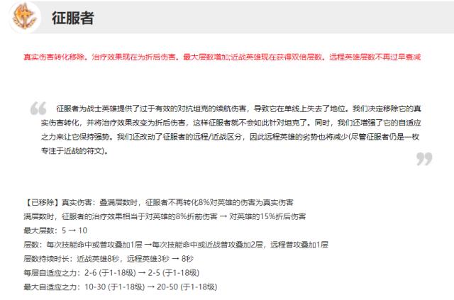 前阵子,英雄联盟迎来了9.23版本的更新,正式更新到季前赛版本,召唤师峡谷进入元素崛起时代,而在这个版本天赋符文最大的变化无疑就是征服者符文了,如今的新版征服者可以最多叠加10层,普攻或伤害型技能在命中一名敌方英雄时会提供二层效果,持续时间8秒,每层可提供2-5适应之力,远程只提供攻击一次一层的叠加效果,叠满10层后可对敌人造成15%伤害并把这15%转化为对自身的治疗,这个15%的治疗相当于一个吸血装备了,还会因为适应之力跟治疗量获得非常不错的爆发以及续航能力,新版的征服者可以说直接是变成了进化版的战争热诚。