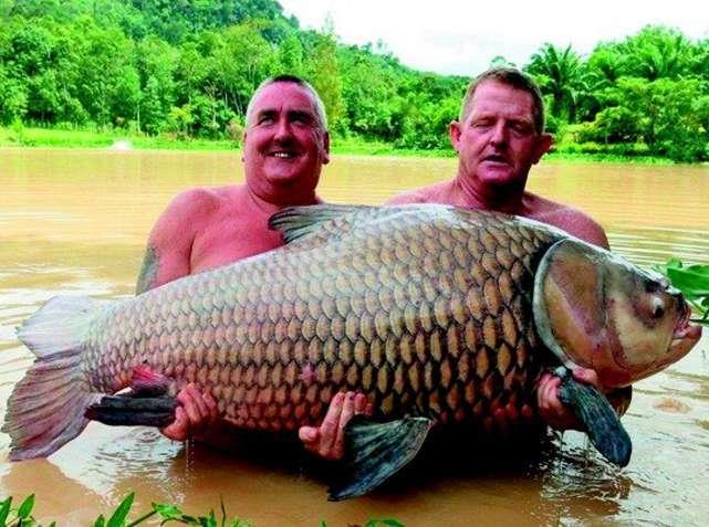在泰国的暹罗河,有许多的巨型鲤鱼。图为:两名外国男子在暹罗河内钓上来的巨型鲤鱼,这条鲤鱼足足有145斤重,两个成年人才干将它抬起。