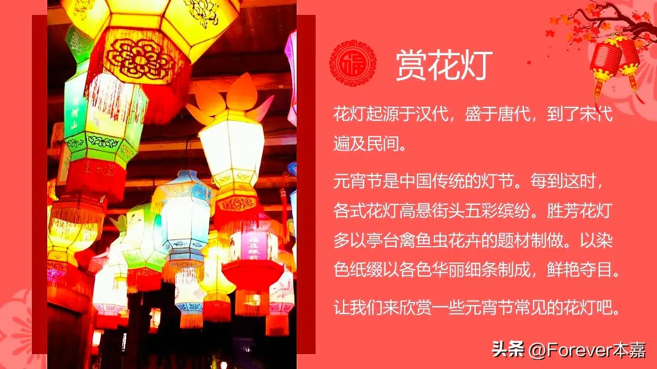 赏花灯:元宵节是赏花灯的最佳时机,各地都会举办盛大的花灯展览,人们可以欣赏到各种精美绝伦的花灯,如龙灯、凤灯、狮子灯等,寓意着吉祥如意和繁荣昌盛。