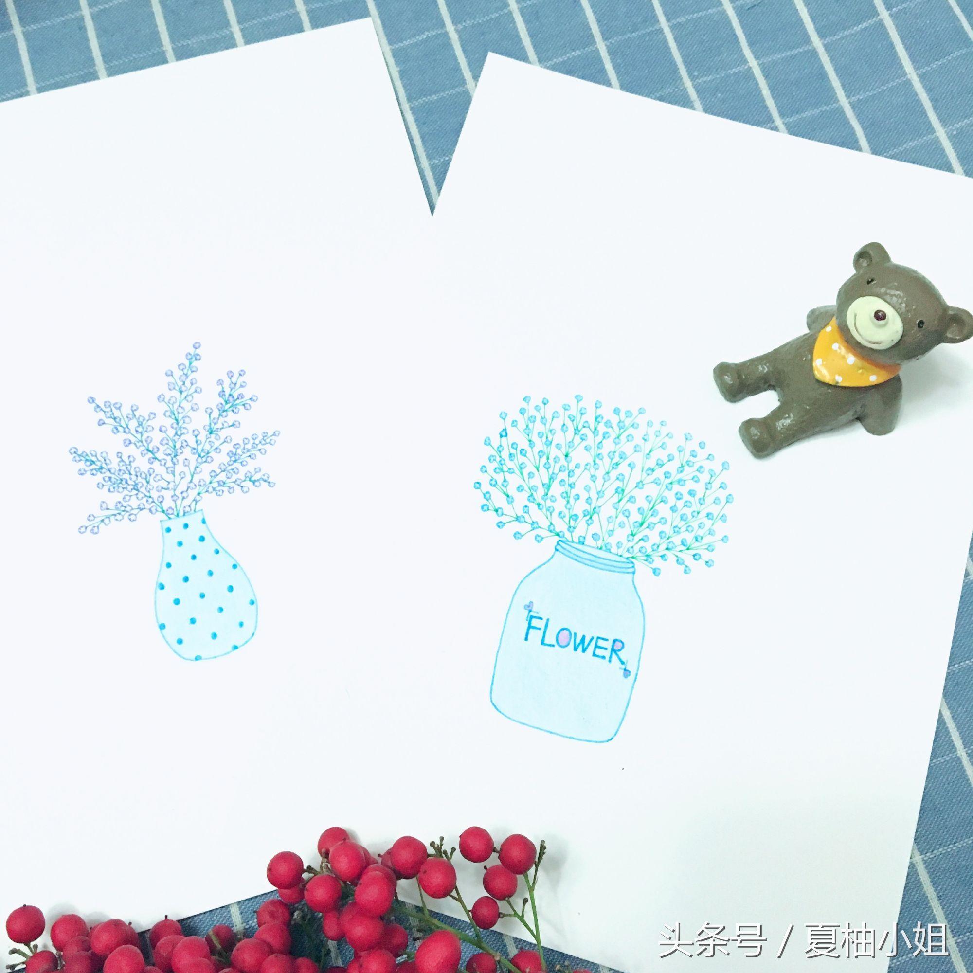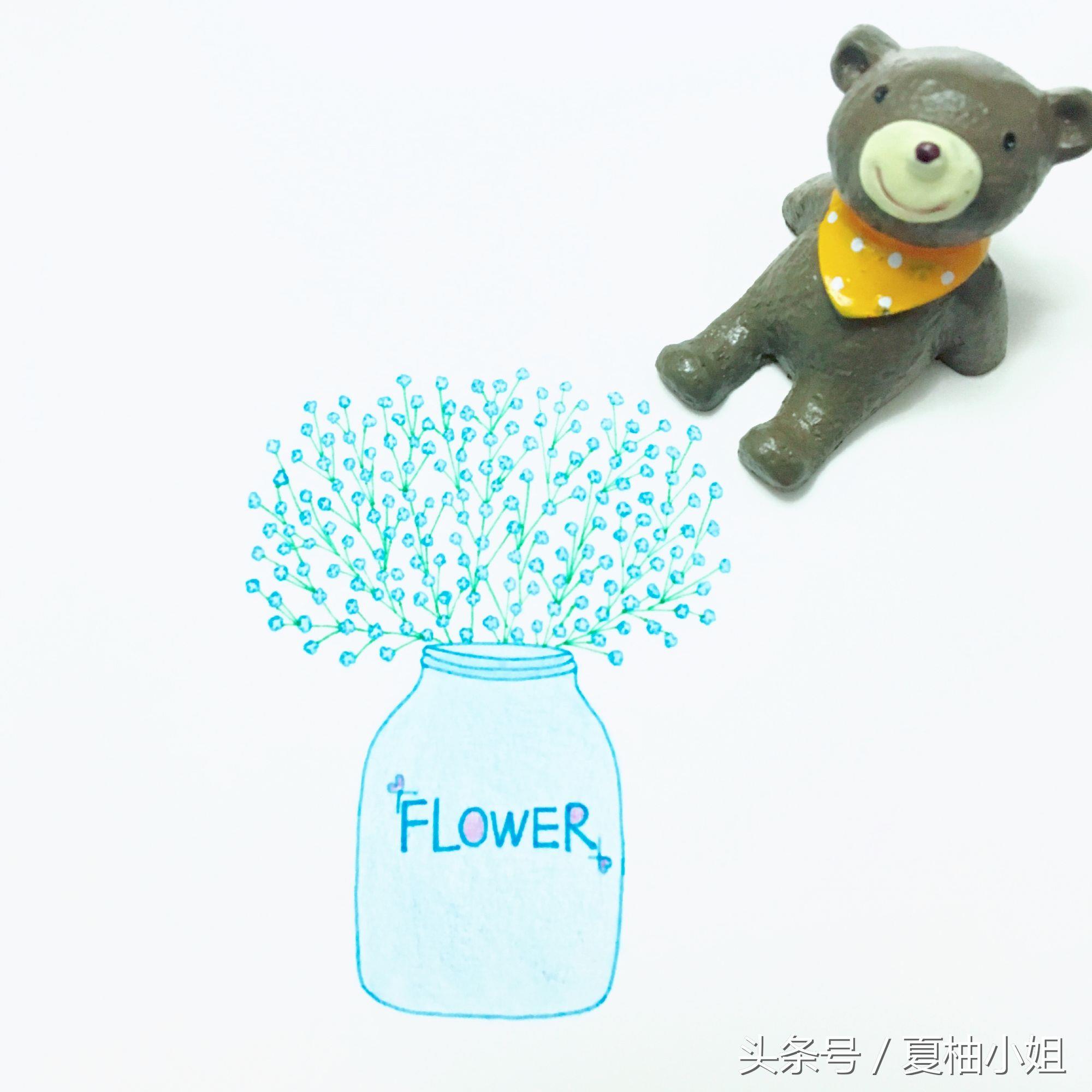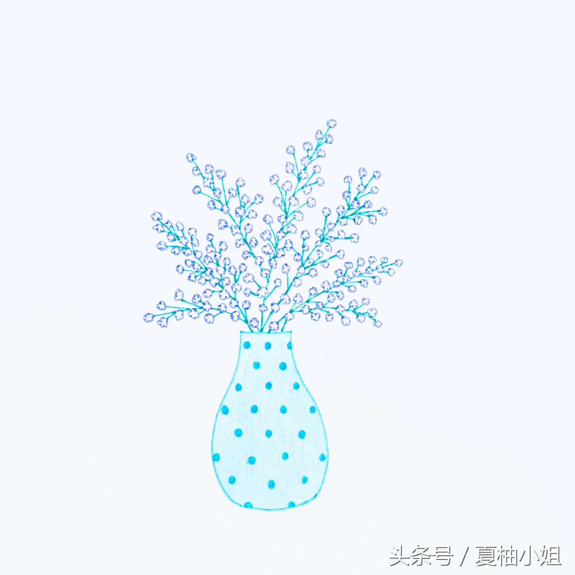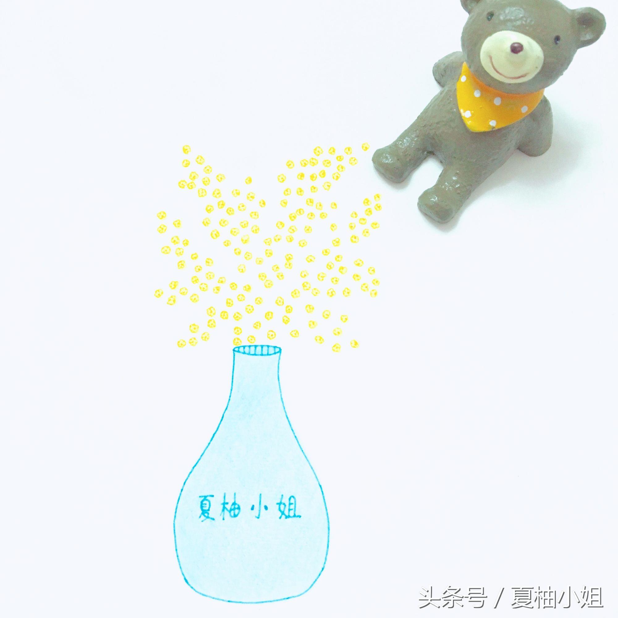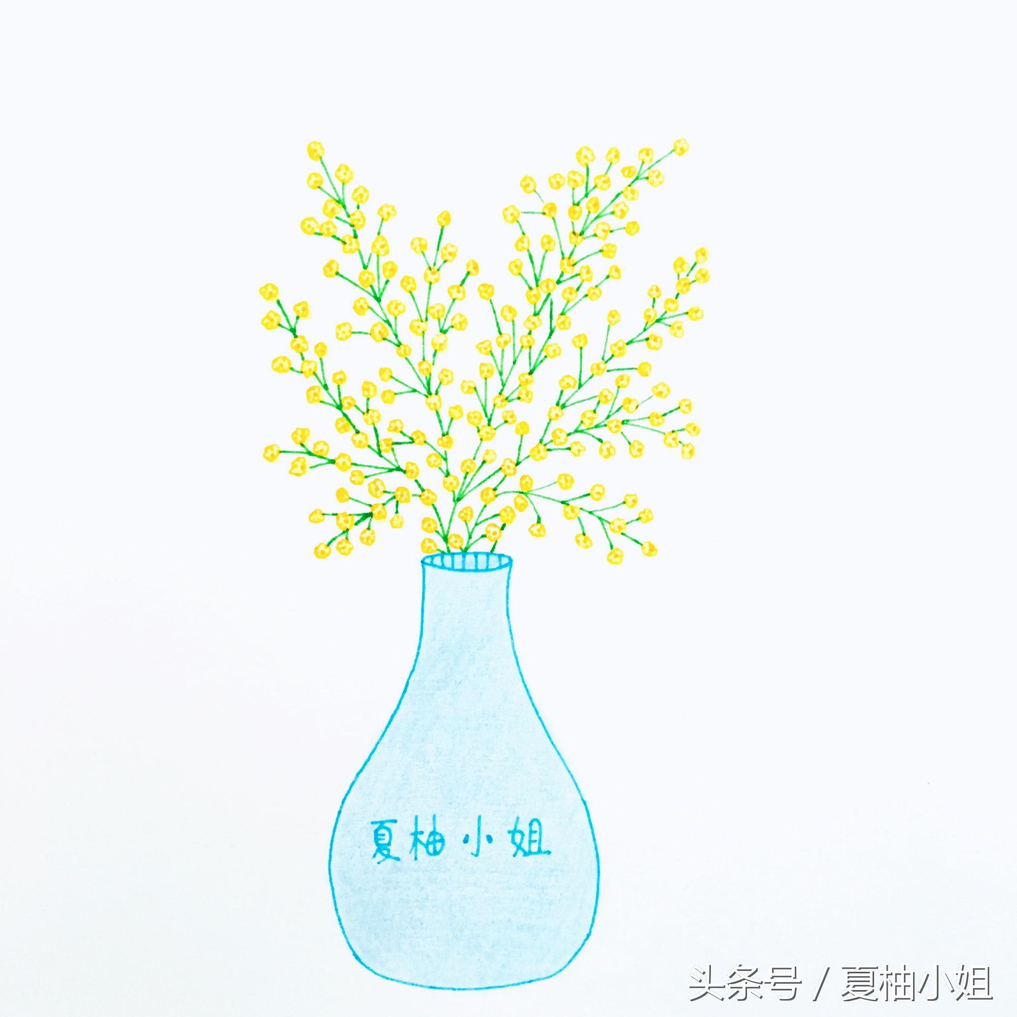 先画个蓝色的花瓶。再用黄色随意画一些细碎的小花,彩色中性笔勾线,彩铅上色。