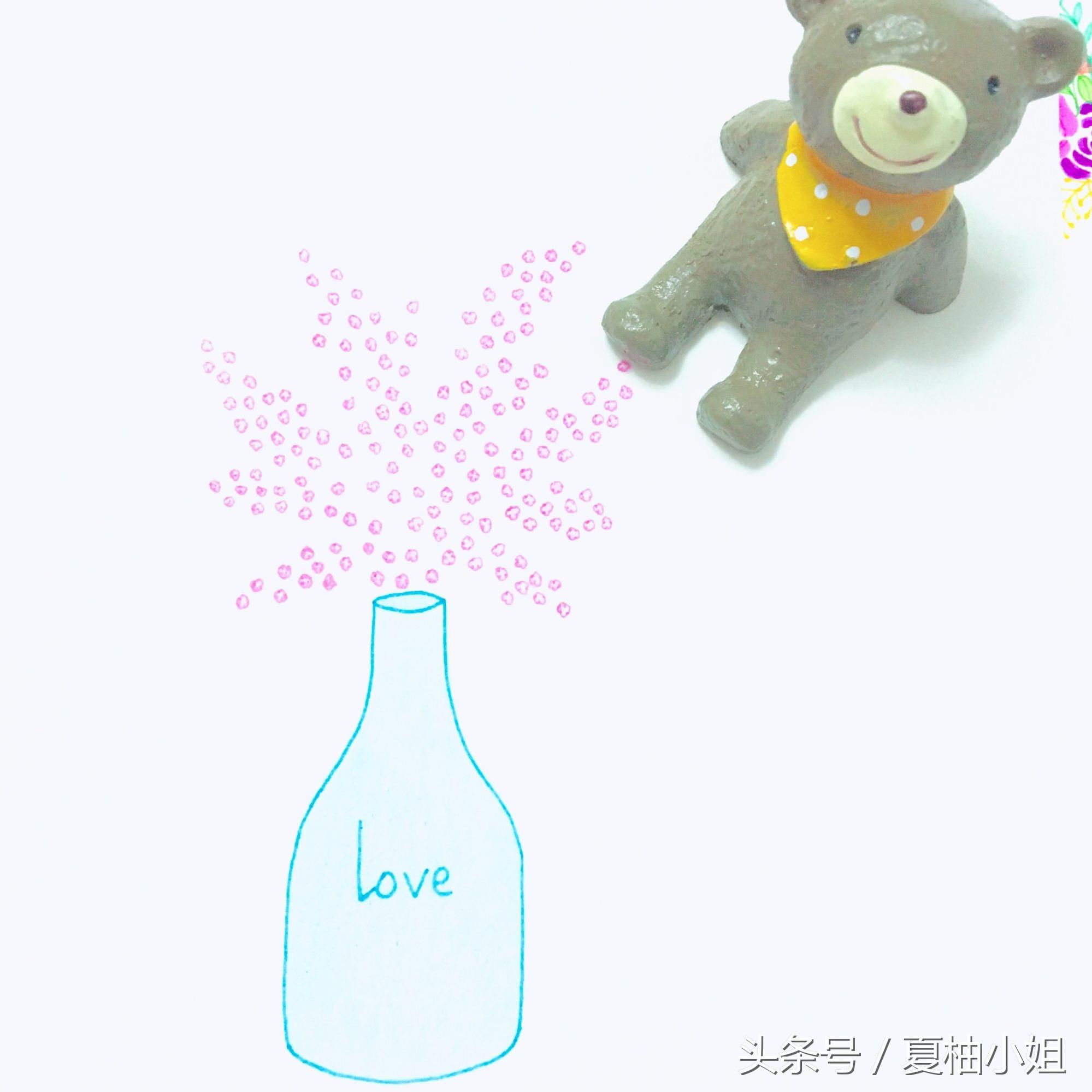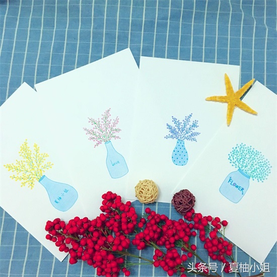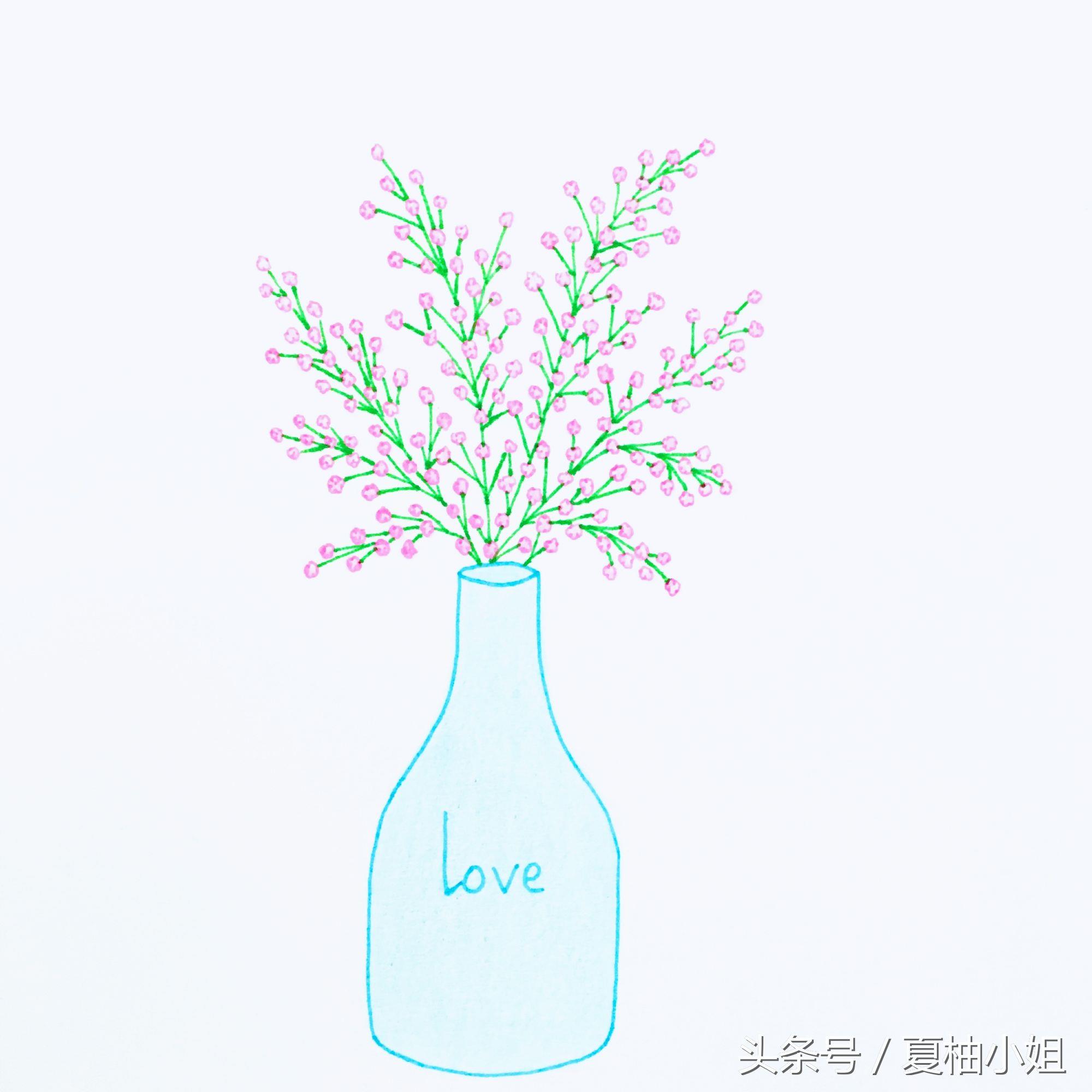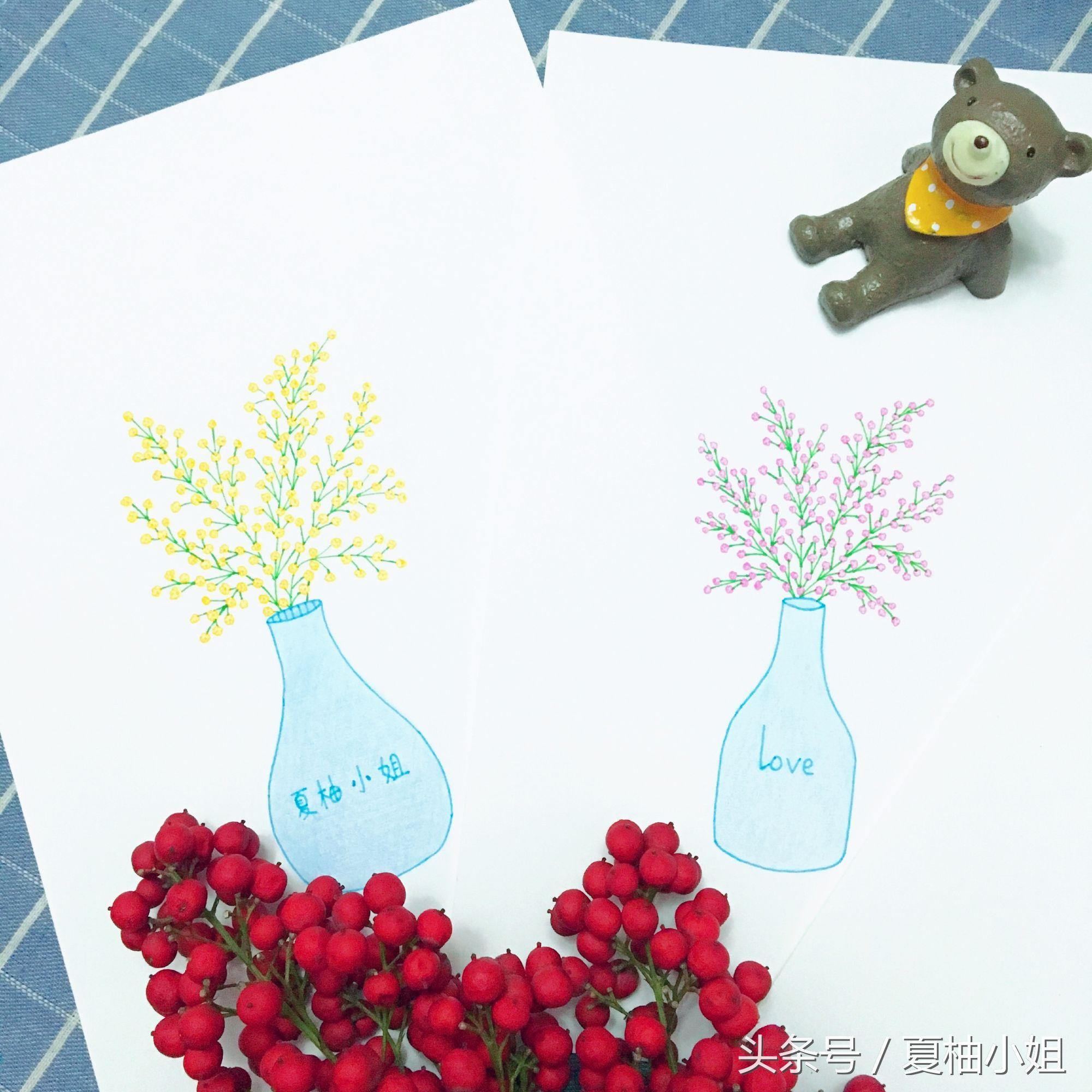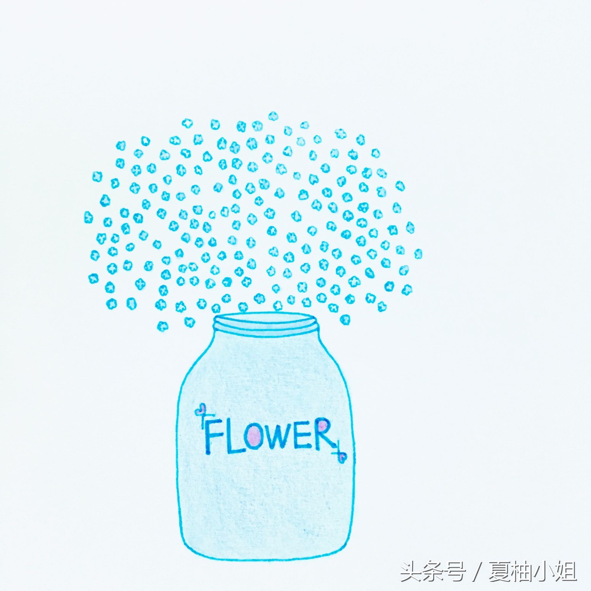 先画个蓝色的花瓶。再用黄色随意画一些细碎的小花,彩色中性笔勾线,彩铅上色。