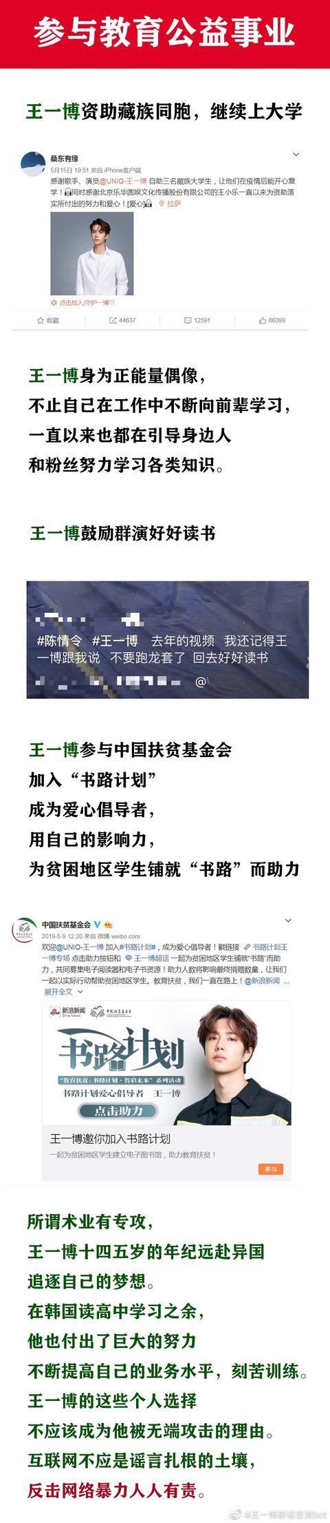 ③成为艺人后王一博一直热心参与教育公益事业,做出了包括资助藏族同胞上大学、参与扶贫基金铺就“书路”等诸多善举。
