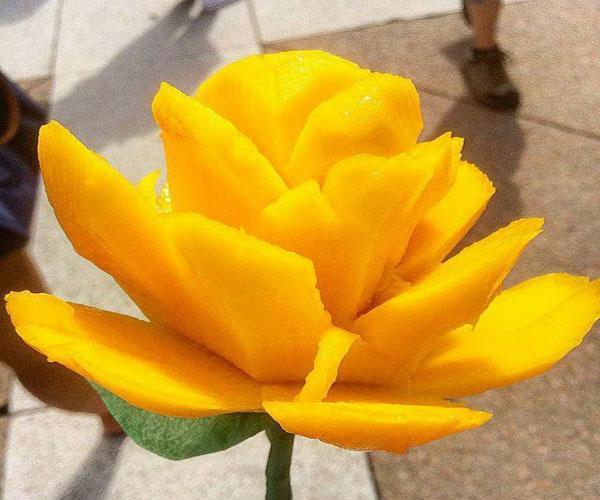 给大家介绍一下它的做法,先拿一个大芒果洗干净,在底部穿一根棍子,在把皮削掉,在从侧沿切花,这个可是很简单的哦