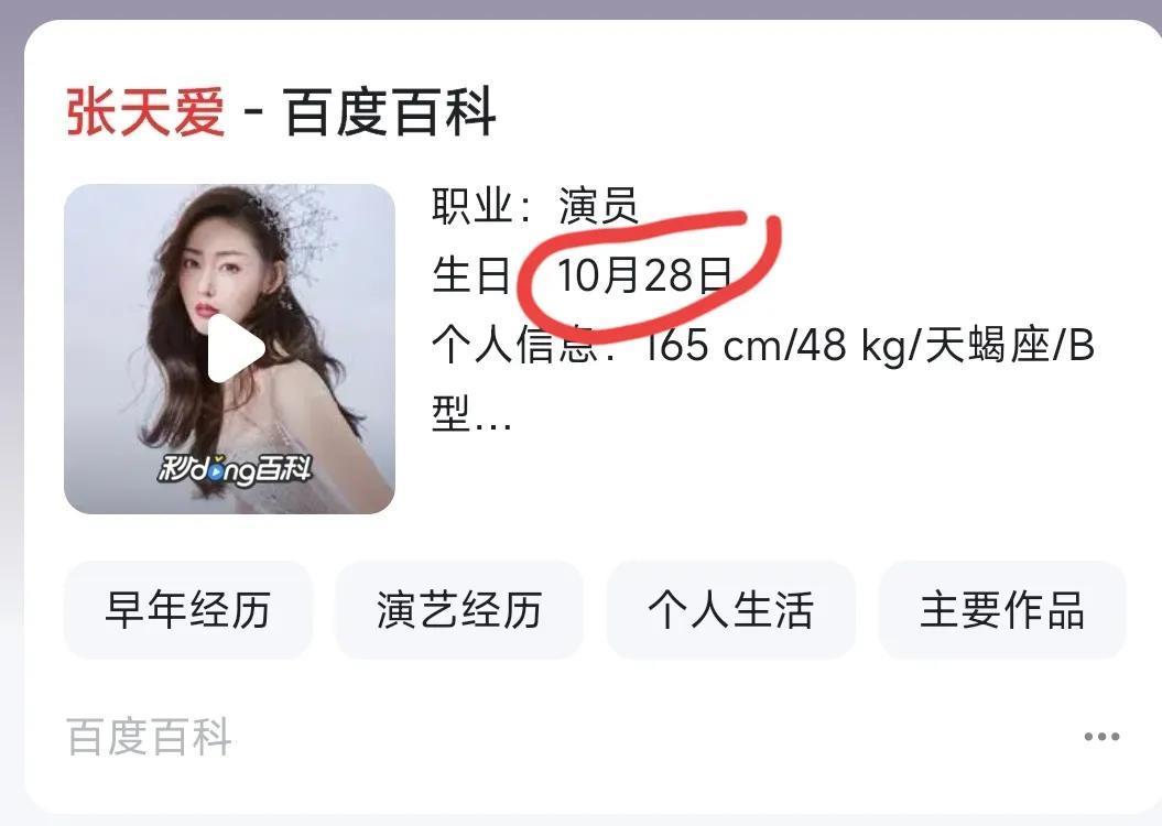 就当大家开始信以为真的时候,又发生了一件匪夷所思的事,就是张天爱的出生年份又更改了,这次的出生年份直接改到了1992年。