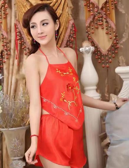 肚兜一般是用一整块布或者绸缎做的,没有袖子及后幅,有方形、三角形、菱形的样式,遮盖体前从胸骨到小腹的部位。四边有带子,上端的两根带子套在颈后,左右端的带子束于腰后。一些肚兜加以精美装饰,上面会绣上各种花鸟图案。