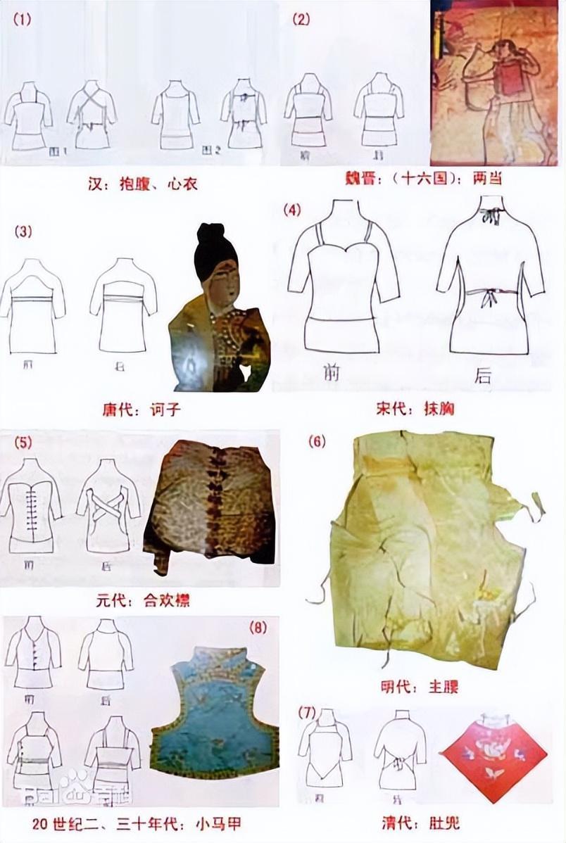 魏晋南北朝称为缠弦,宋代称为袜胸。“袜胸”穿着后“上可覆乳下可遮肚”,整个胸腹全被掩住,因而又称“抹肚”。用纽扣或带子系结。平常人家多用棉制品,俗称土布,大户人家用丝质品并在其上绣以花卉。单的夹的,形式不一。