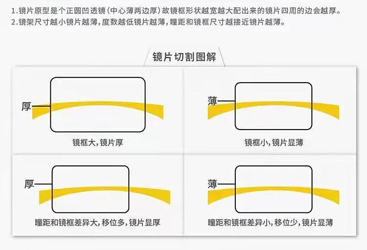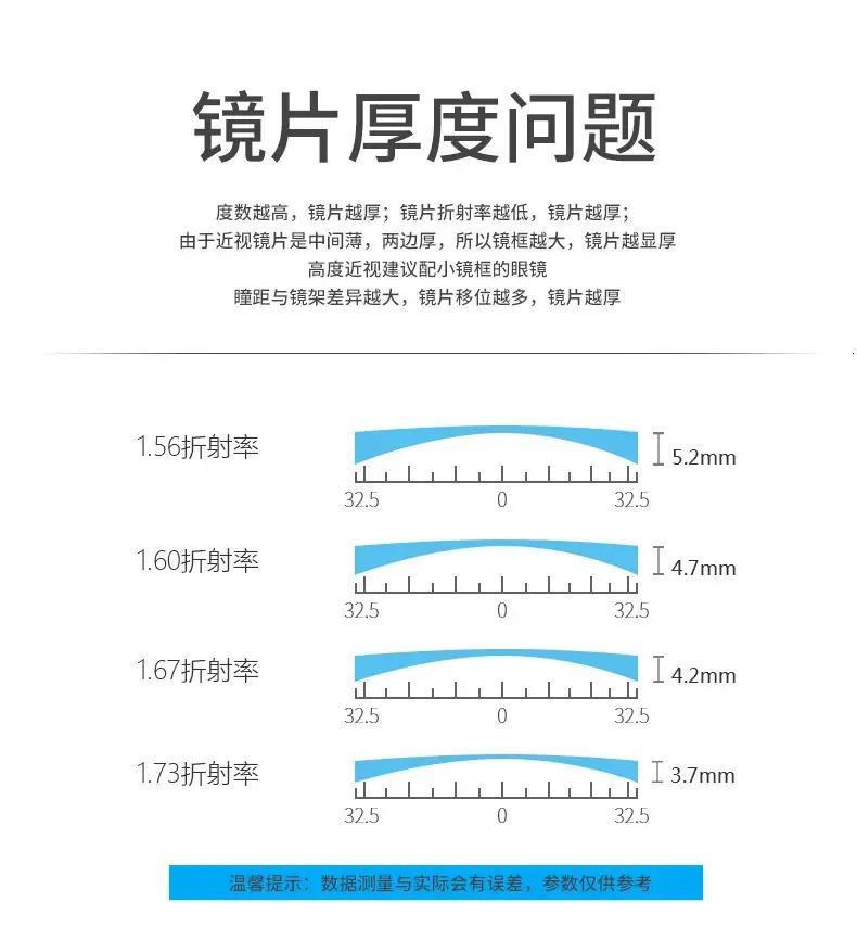 不少朋友应该对折射率都不陌生,肯定会说这个我知道,就是折射率越高,镜片越薄嘛,这么说也不全对,科学的比较,对照组必须其他变量固定了才有比较。影响镜片厚度的有近视度数,瞳距,镜框大小,瞳距。度数和瞳距根据验光出来时固定了,镜框选好后,就是折射率越大镜片越薄了。一般也建议度数高的朋友镜框尽量选小点。