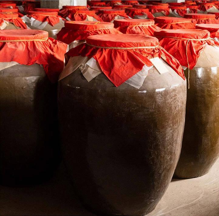 传统酿酒工艺流程:原料——浸泡——初蒸——焖粮——复蒸——出甑摊凉——加曲——装箱培菌——配糟——装桶发酵——蒸馏——成品酒。
