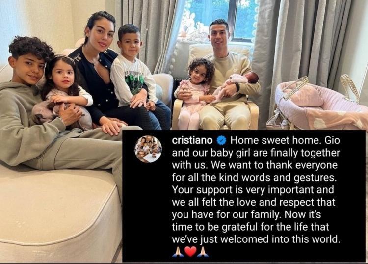 C罗表示,感谢所有人友善的话语和举止(之前利物浦球迷曾集体为C罗送出祝福),“你们的支持非常重要,我们整个家庭都感受到了你们的爱和尊重。”C罗左手抱着自己的小女儿,提到了她的小天使:“感恩这个刚刚被我们带到这个世界的小生命。”