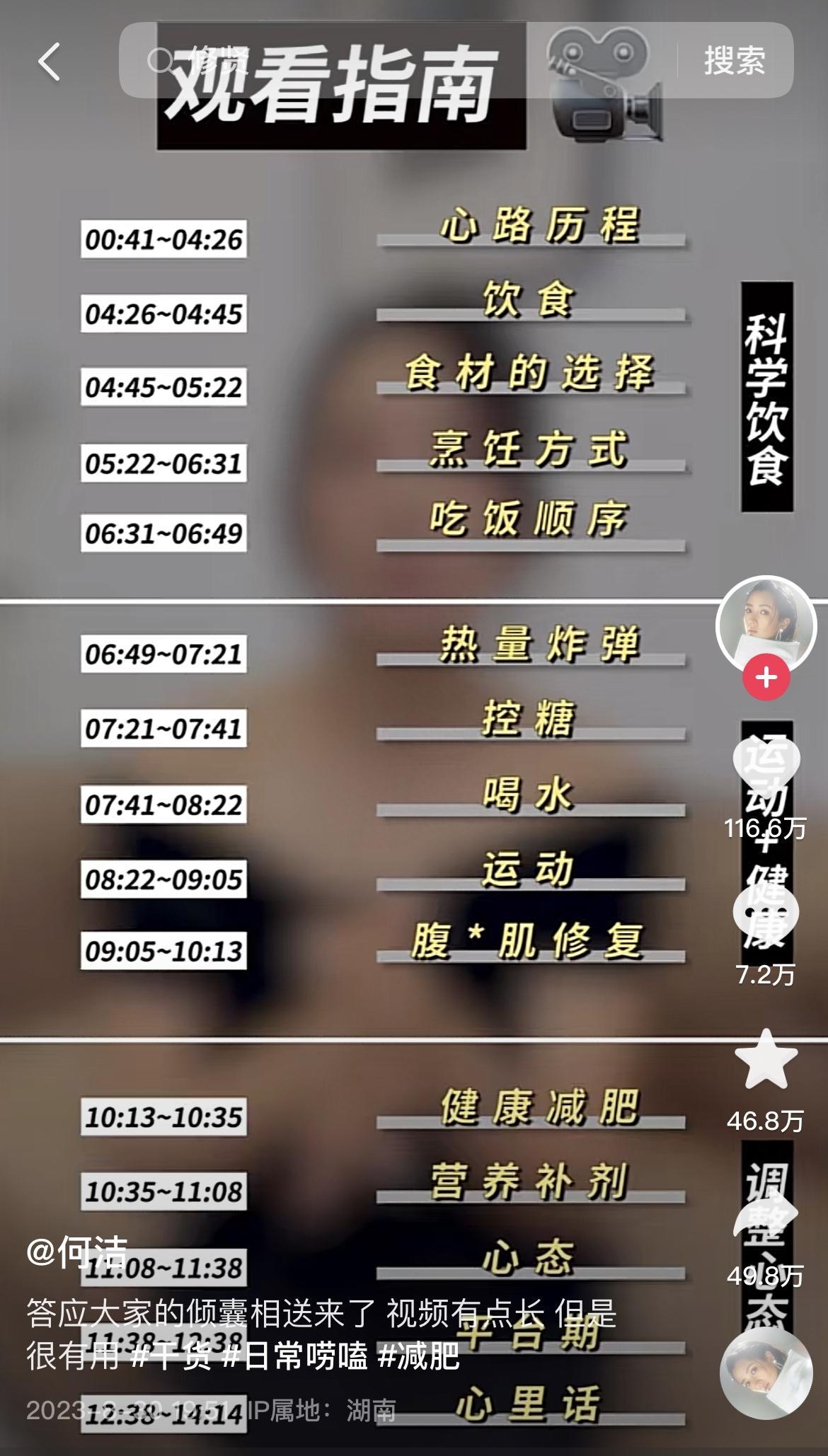 长达14分钟的视频中何洁分门别类从饮食讲到运动,又从运动讲到心理健康,事无巨细,生怕观众漏下一个地方。