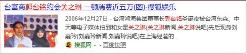 2006年底,有媒体爆料,56岁的郭台铭约会44岁的关之琳,在上海某酒吧举止亲昵,一晚消费50万。
