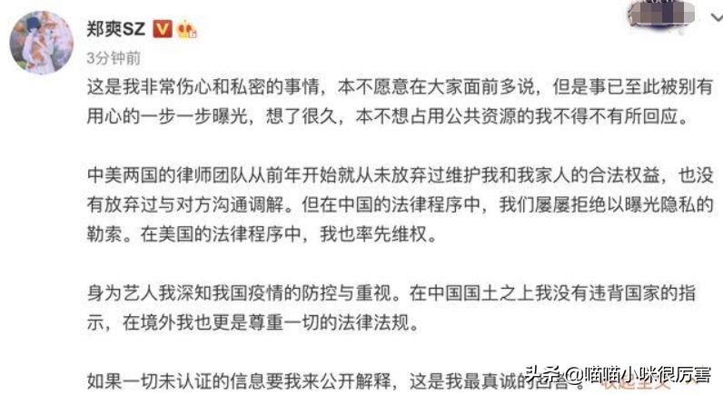 在张恒第一次爆出郑爽两个孩子的来历时,郑爽也发表了自己的回应。