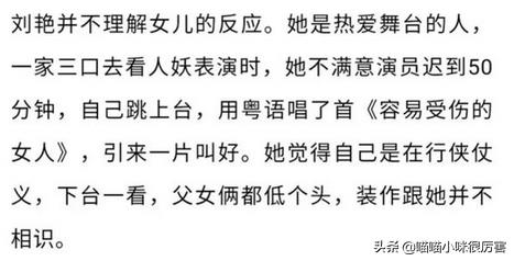 刘艳特别喜欢表演,喜欢到有些匪夷所思了,去看表演的时候,表演者没来她都能自己加戏上去表演。