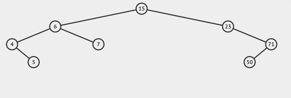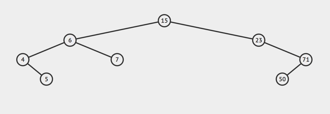 从任意节点开始,节点左侧节点值总比节点右侧值要小。例如。一个二叉排序树依次插入15,6,23,7,4,71,5,50会形成下图顺序