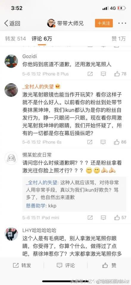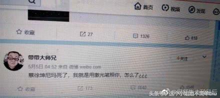 近日有一名是微博名:叫做“带带大师兄”的人在微博上放话:蔡徐坤尼玛死了,就是我激光笔照的怎么了,还直呼又没什么事情。