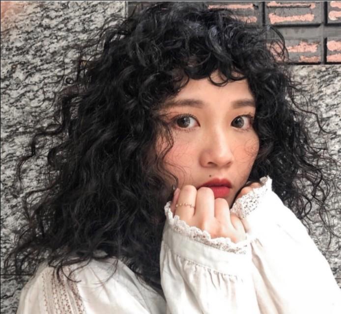 泡面卷搭配短短的卷刘海,可萌可性感,超级显发量,眉上刘海比较适合脸型比较短的女生,搭配黑色发色更有复古的感觉,发量多的妹子还是建议不要烫这种卷发啦,真的非常非常显发量哦,蓬松感贼好。