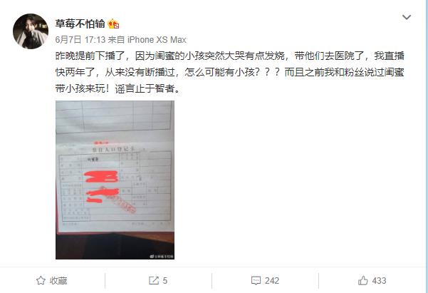 虎牙草莓近日遇到了一波问题,就是她在直播的时候,直播间忽然有孩子哭,随后很多人都认为草莓是一位妈妈。而草莓也对此事出面澄清了,并且发微博证明自己未婚,还是一个小仙女,希望大家不要带节奏。于此同时,草莓退网的大哥也宣布回归。