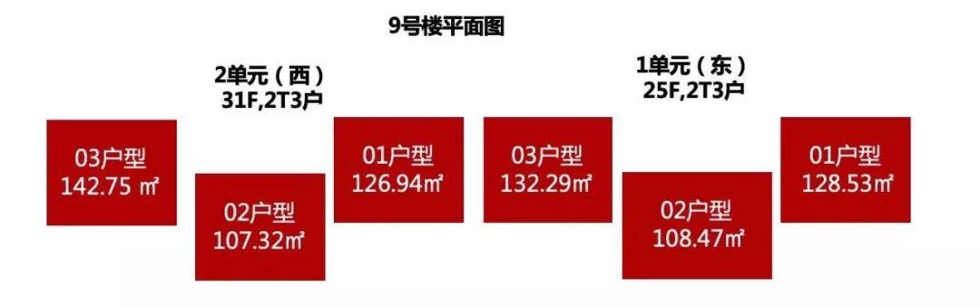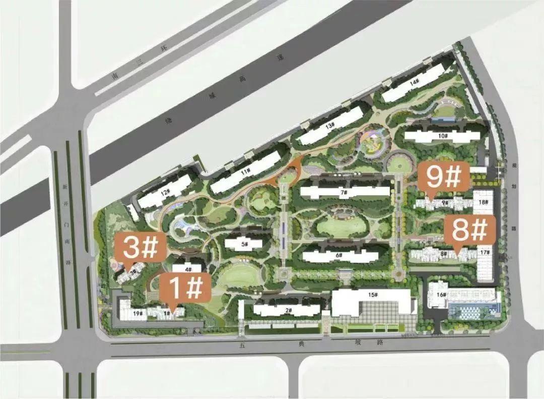 其中8号楼为2个单元,总高27、25层,9号楼为2个单元,2梯3户设计,总高31/25层,以下为楼位分布图:
